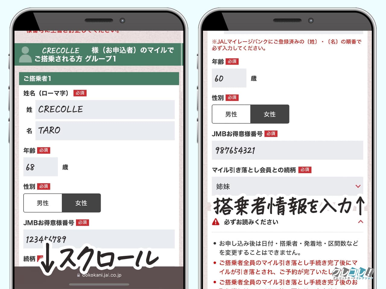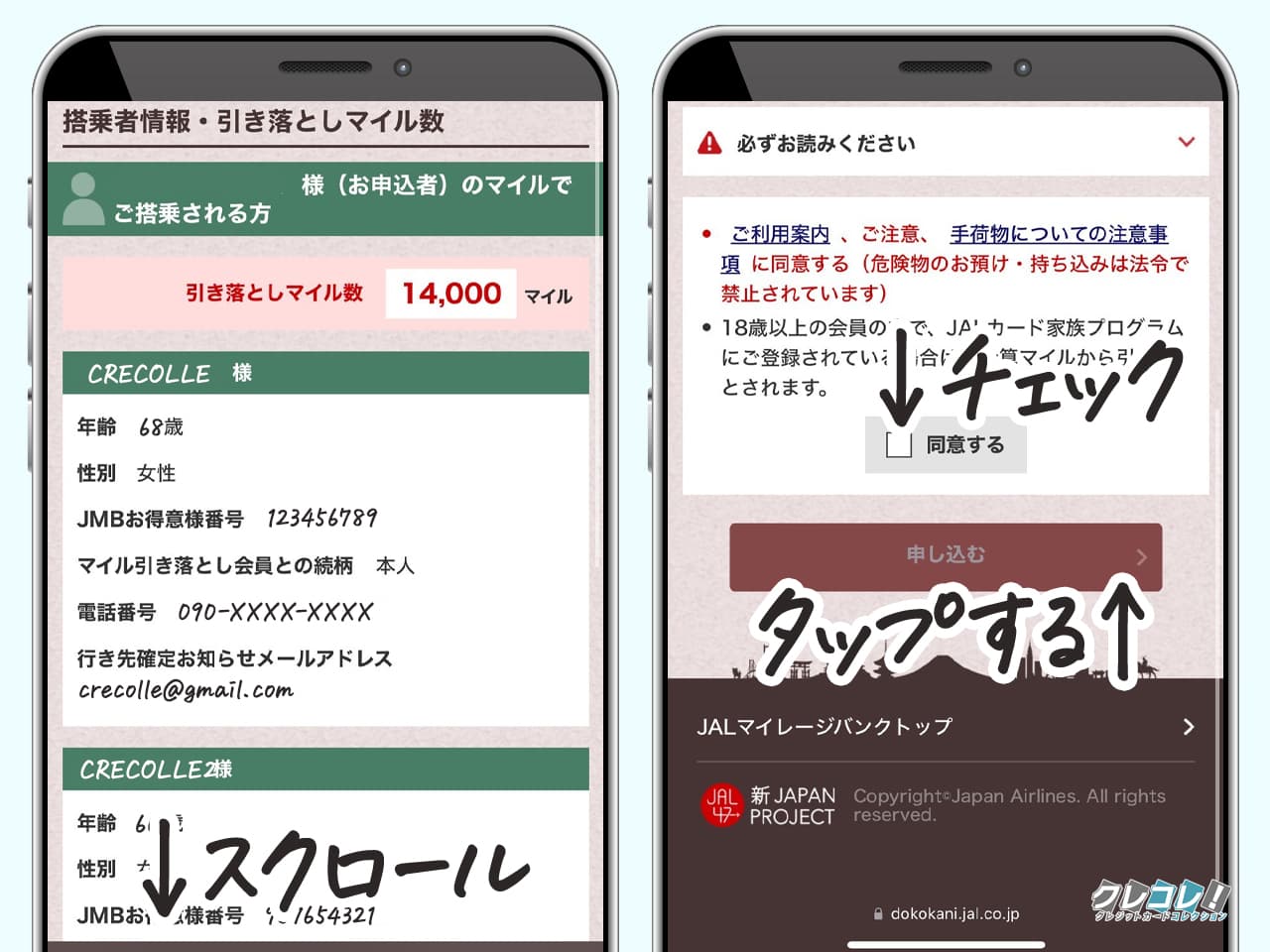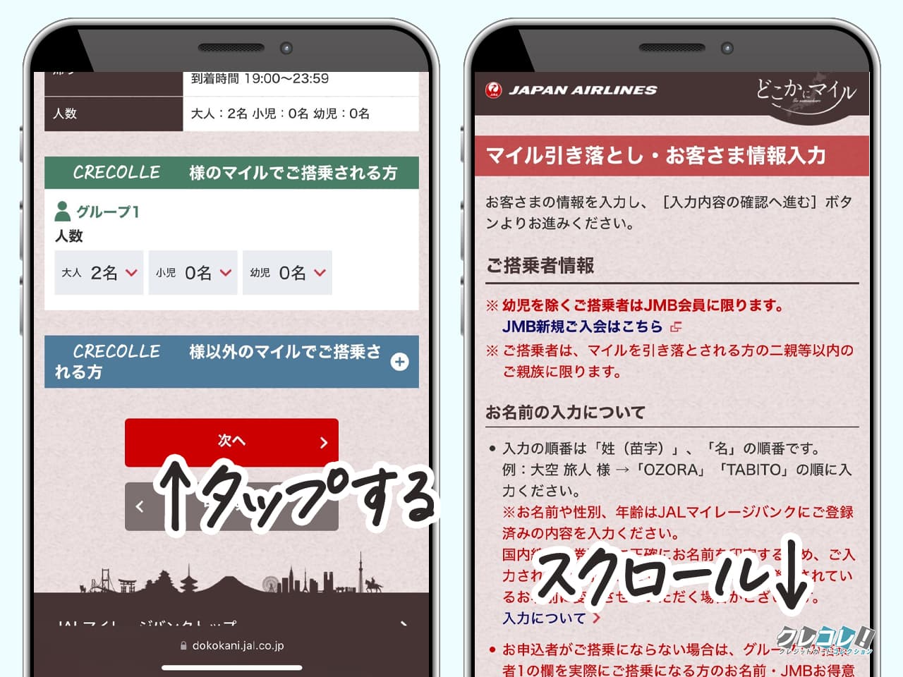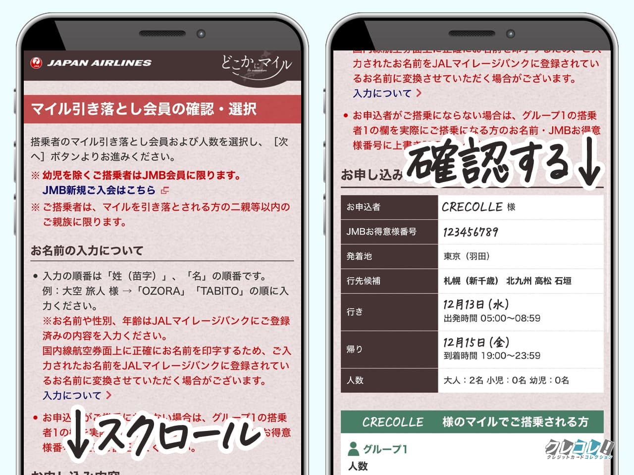 申し込み者のマイルで飛行機に乗る人数と、自分のマイルで飛行機に乗る人数を入力。