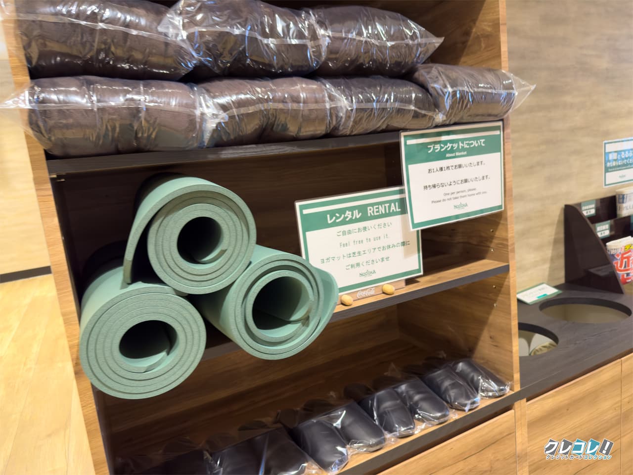 ブランケット、スリッパ、ヨガマットがあります。