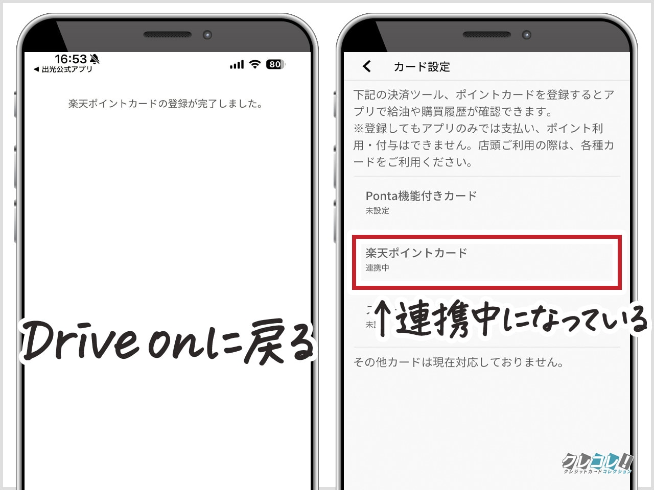 「楽天ポイントカードの登録が完了しました。」と表示されたらDrive Onアプリに戻ります。