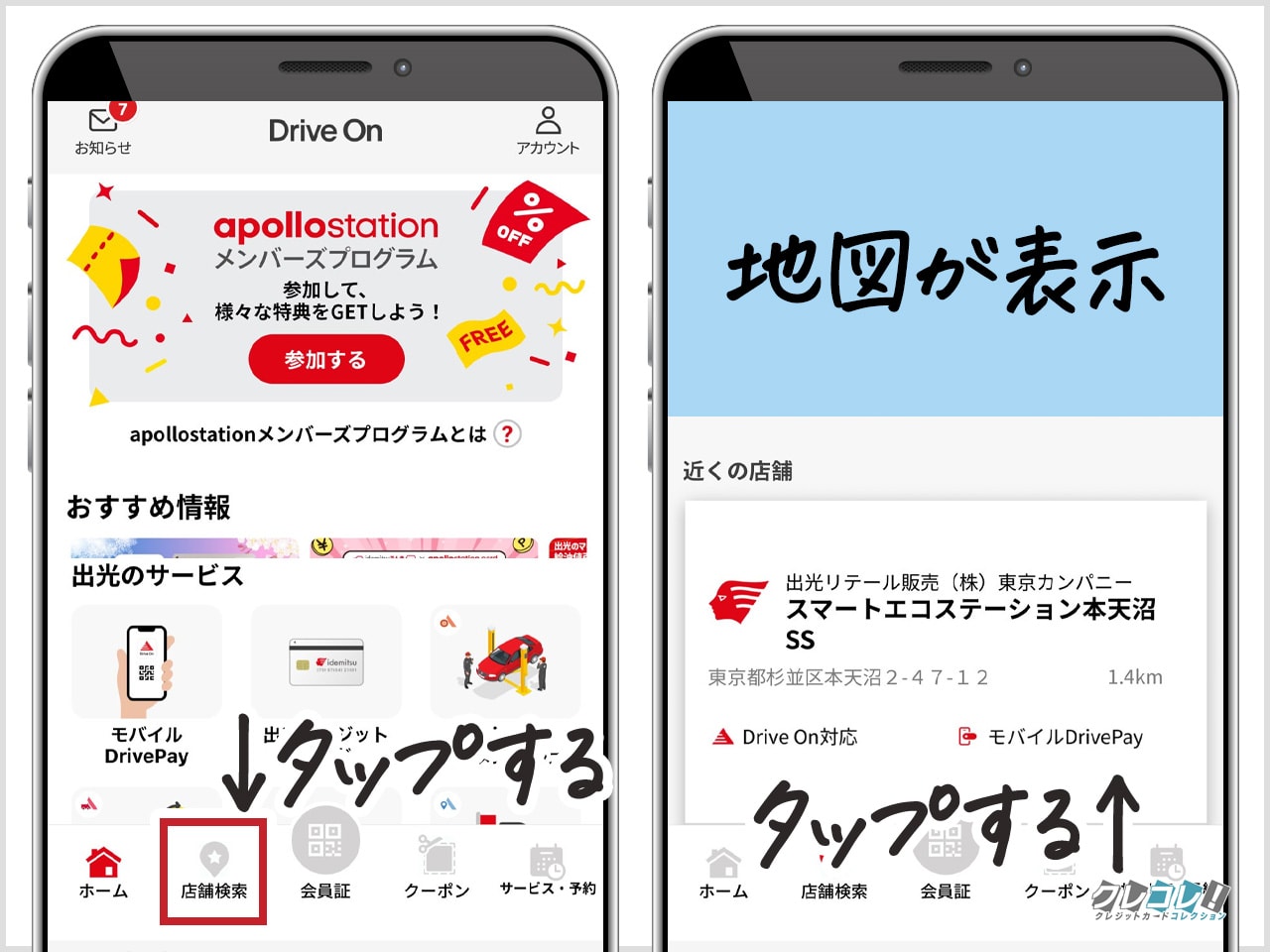 Drive Onアプリを開いて、画面下部にある「店舗検索」をタップすると周辺にあるapollostationが表示されるので、登録したい店舗をタップ。
