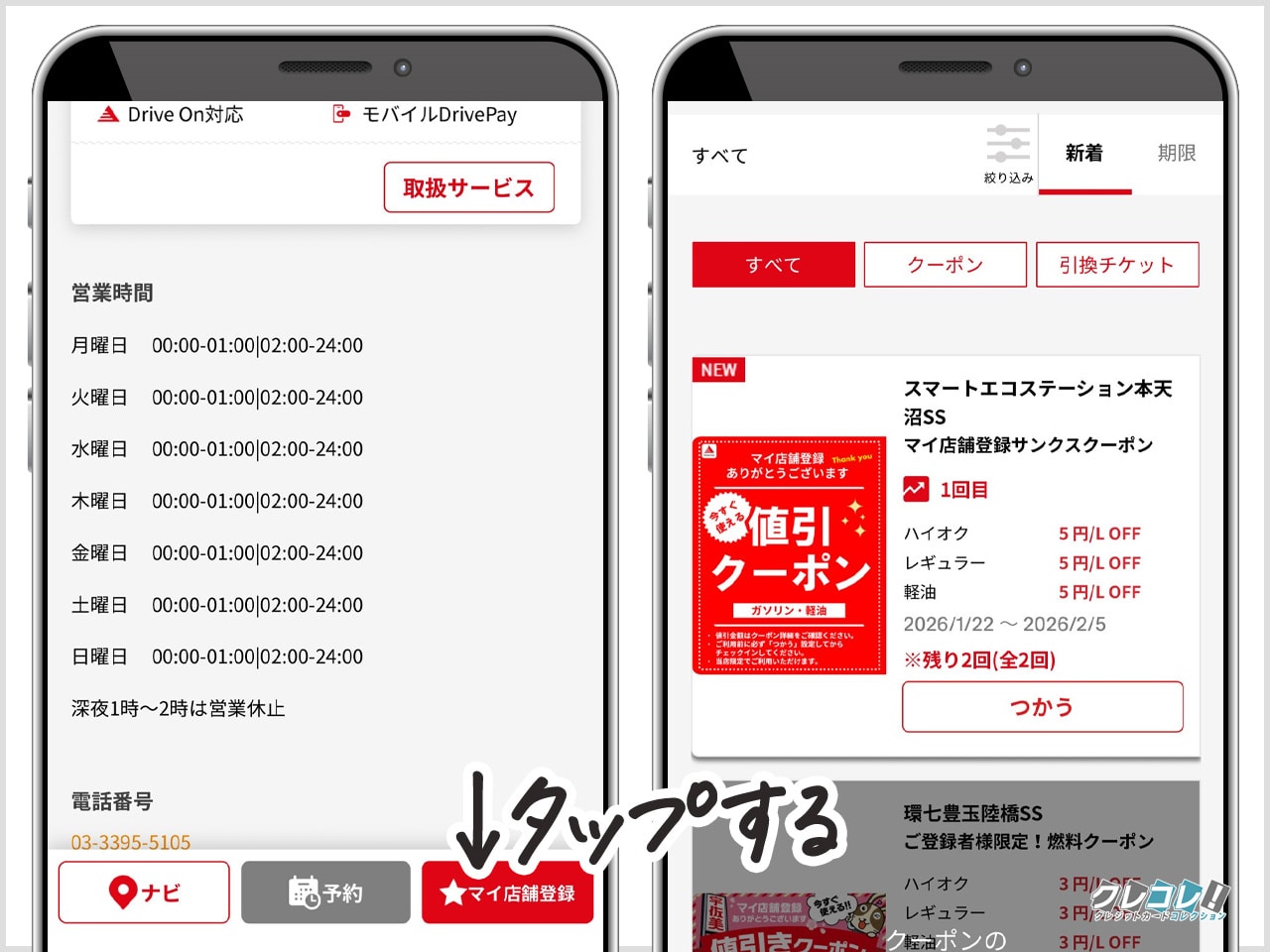 Drive Onにはよく使うガソリンスタンドを5ヵ所登録できるシステムがあり、登録した店舗のクーポンが定期的に届きます。