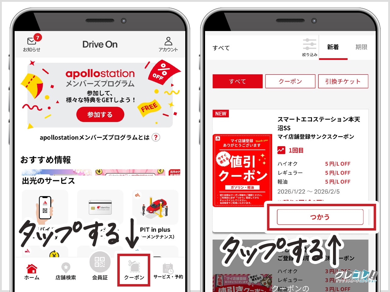 Drive Onアプリを開いて、画面下部にある「クーポン」を選択すると使えるクーポン一覧が表示されます。