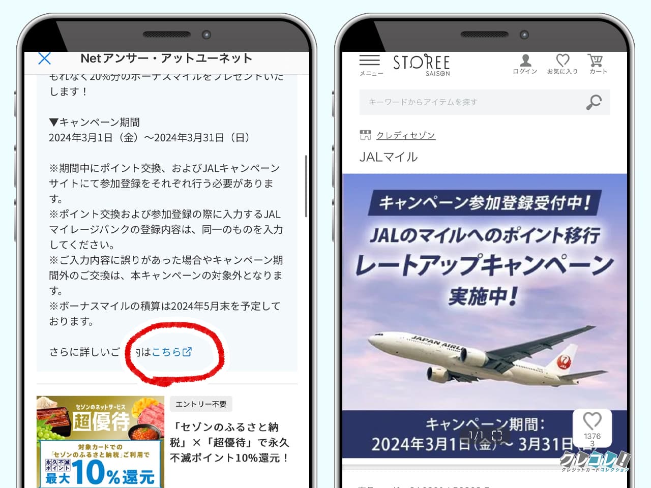 ストーリーセゾンのJALマイル交換ページの中にある「キャンペーン詳細はこちらから!」をタップしてキャンペーンページにアクセスします。