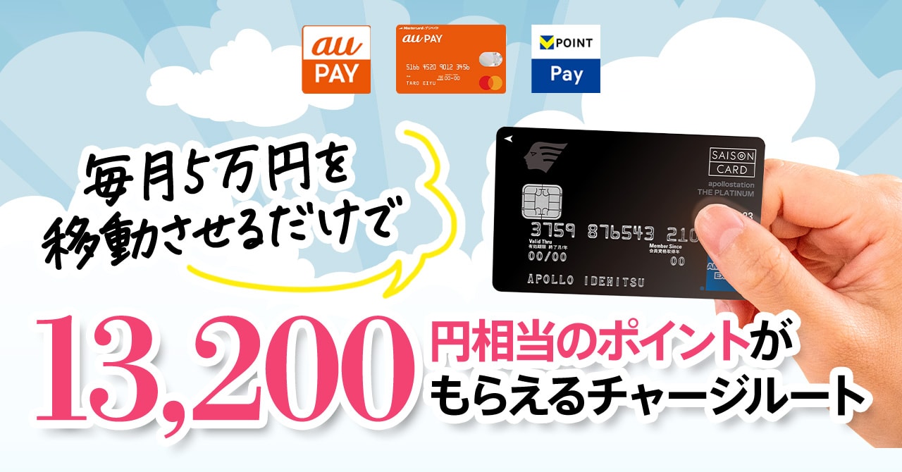 多くのクレジットカードではau PAYへのチャージでポイントは貯まりませんが、apollostation THE PLATINUMは貯まります!還元率も下がりません。