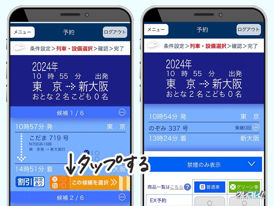 いくつか候補の新幹線が表示されるので、希望の時間の「この候補を選択」をタップします。