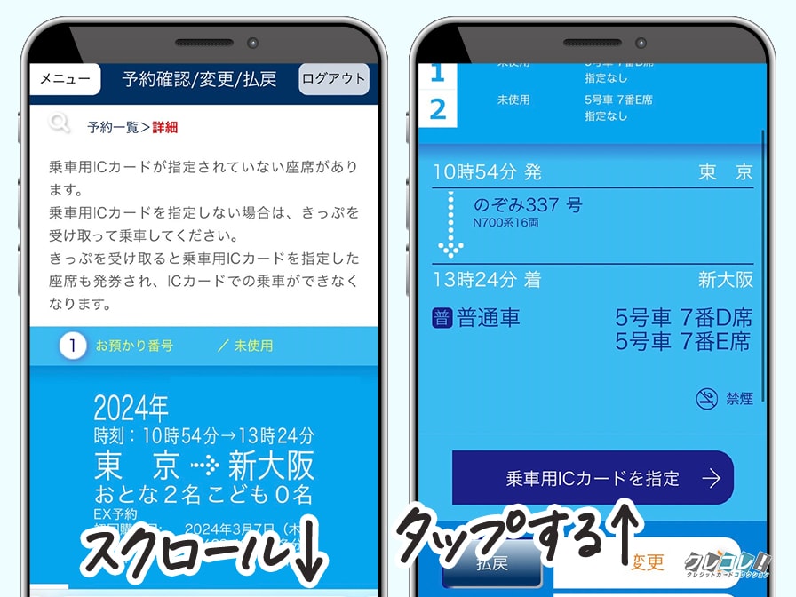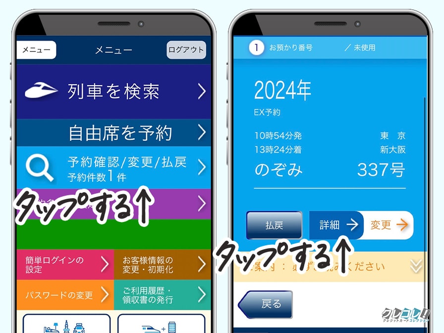 エクスプレス予約の公式サイトから「予約確認/変更/払戻」をタップして、「詳細」をタップします。