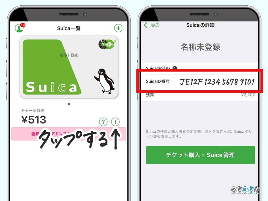 チャージ残高の右側にある「!」を押すと、SuicaID番号が表示されます。