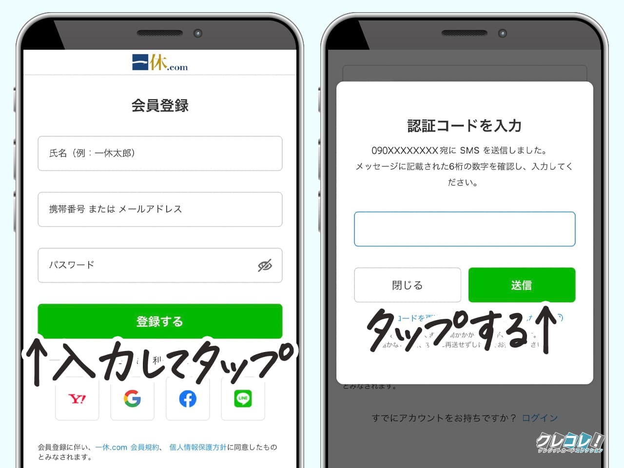 氏名、携帯(またはメールアドレス)、パスワードを入力して「登録する」をタップ。