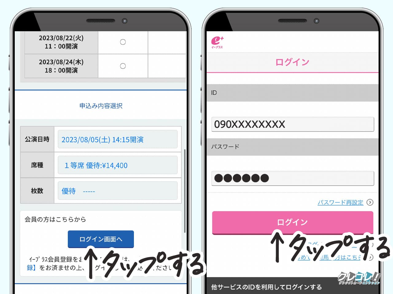 イープラスのログイン画面になるので、IDとパスワードを入力して「ログイン」をタップします。