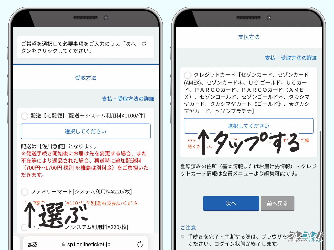 チケットの受け取り方法を選んで、支払方法をタップします。