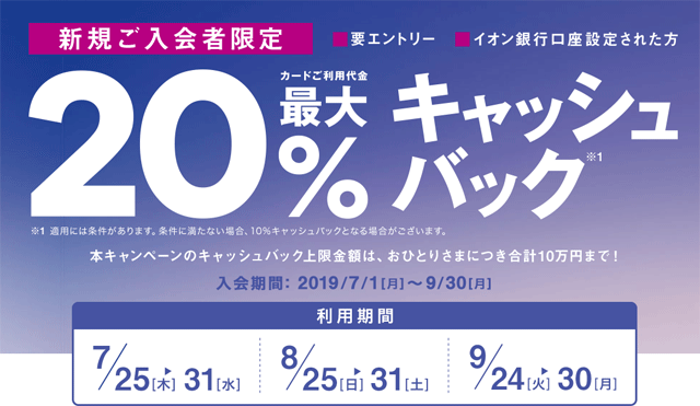 過去、2019年7月~9月まで利用金額の20%の金額がイオン銀行の口座にキャッシュバックされるキャンペーンが実施されていました。