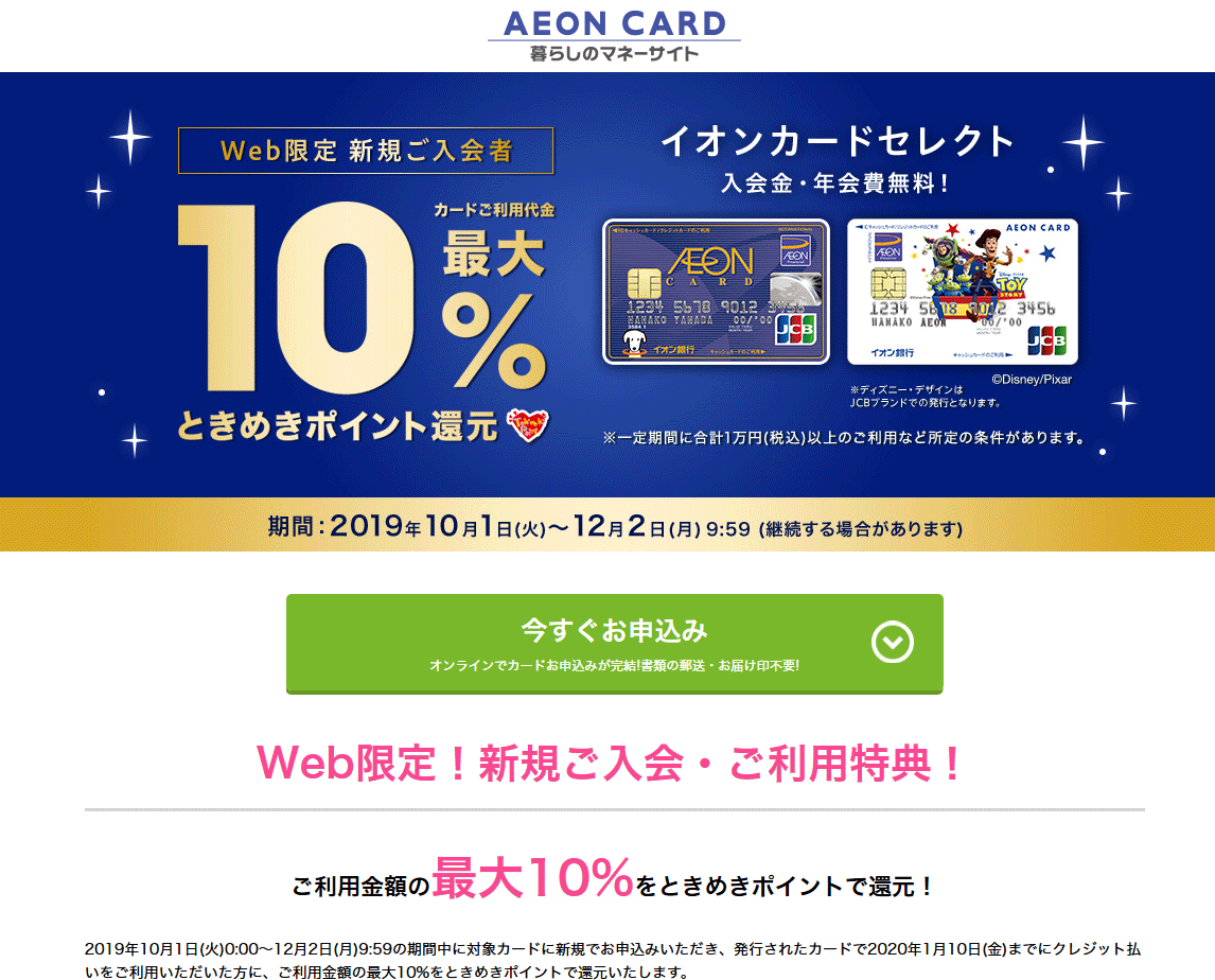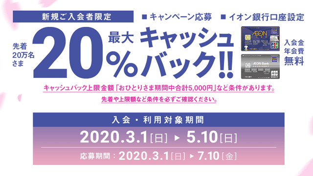 過去、2019年7月~9月まで利用金額の20%の金額がイオン銀行の口座にキャッシュバックされるキャンペーンが実施されていました。