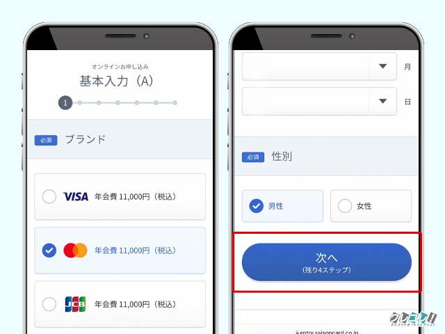 国際ブランドの選択や、名前、生年月日などの基本情報を入力をしていきます。