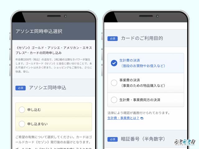 追加年会費2,200円(税込)で発行できるセゾンゴールド・アソシエ・アメリカン・エキスプレス・カードを同時に申し込むかどうか選べます。