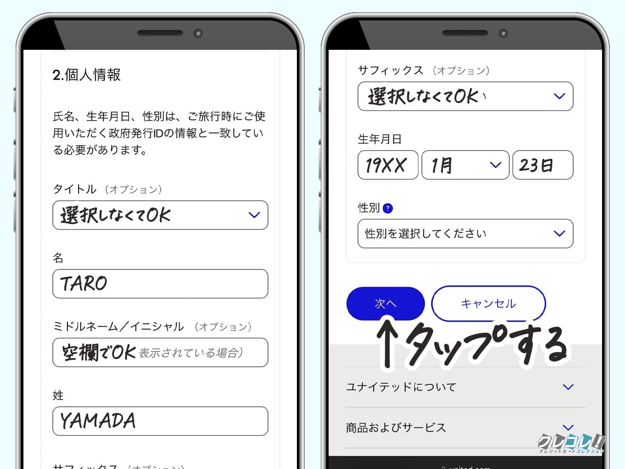 名前、生年月日、性別を入力したら「次へ」をタップします。