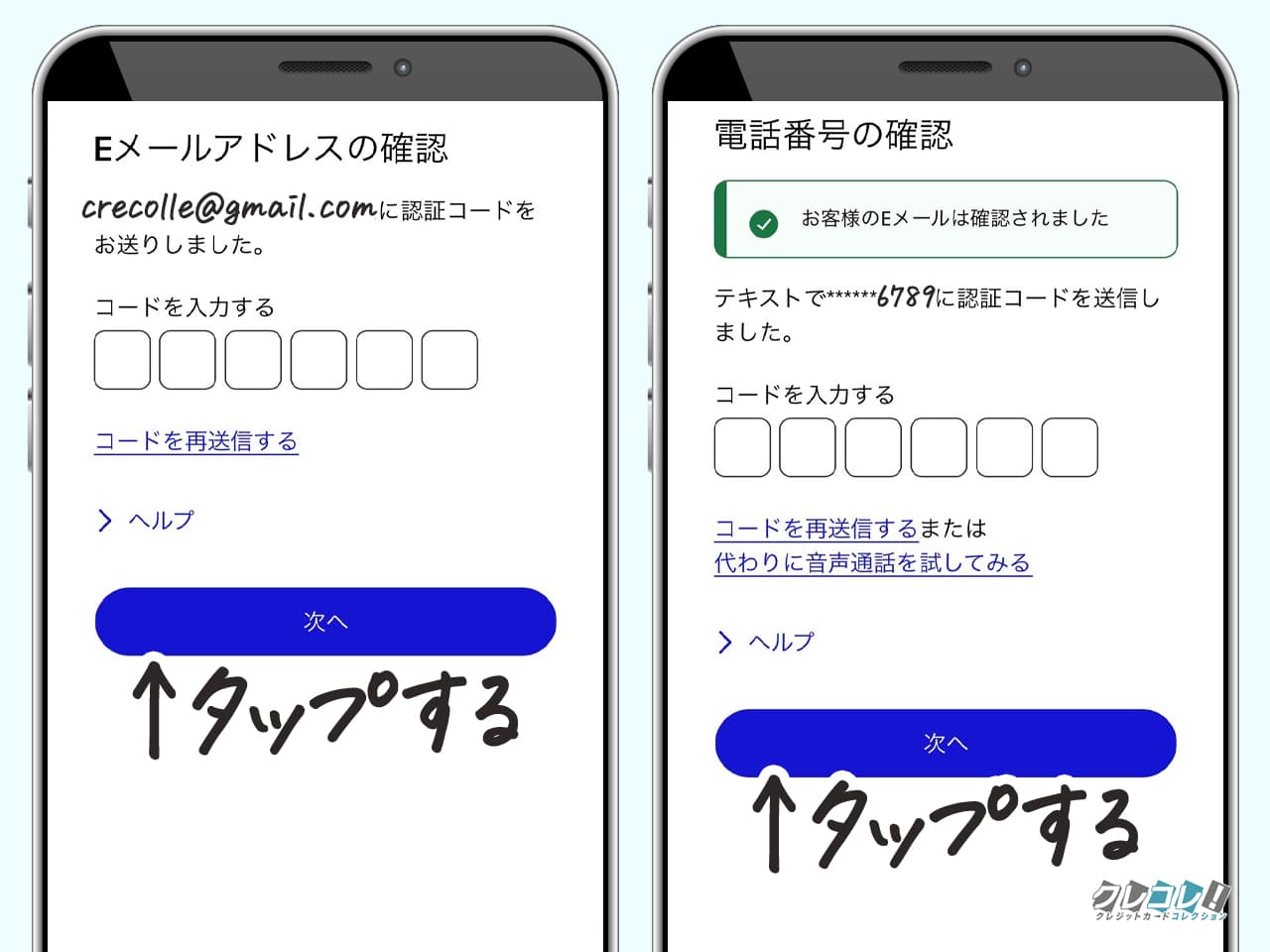 それぞれ届いたコードを入力し、「次へ」をタップ。