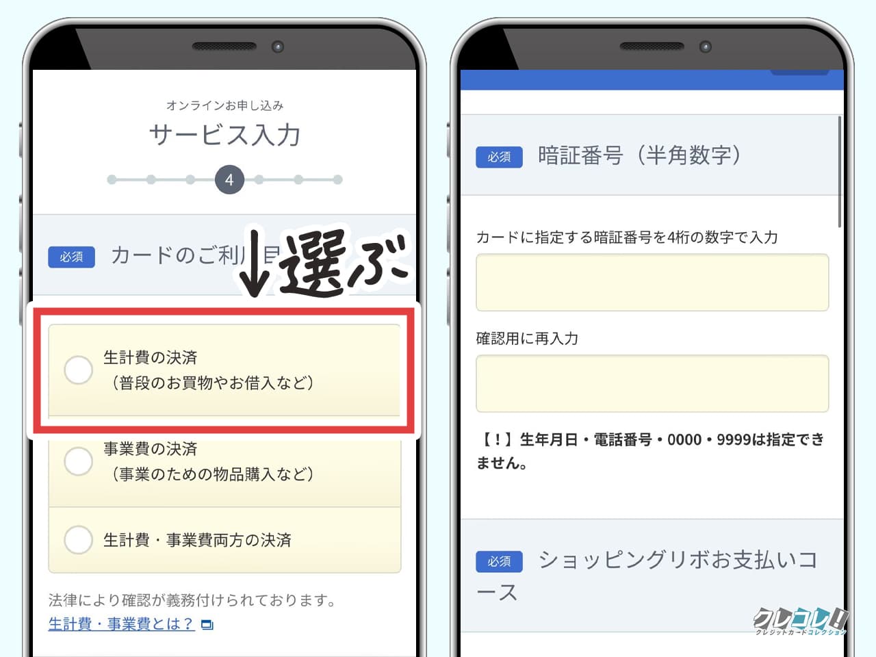 カードの利用目的は「生計費の決済」を選択してください。「事業費の決済」を選択すると審査が厳しくなります…。