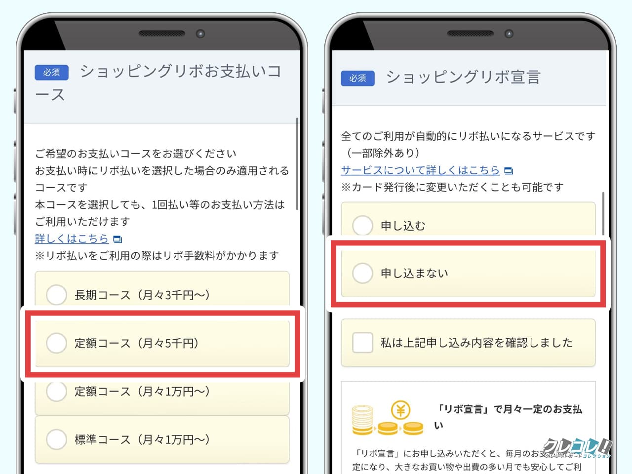 ショッピングで「リボ払い」を使った場合、ここで選んだ支払いコースが適用されます。リボ払いを使わなくても選ばないといけません。