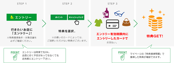 エントリーした後に街やお店でクレジットカードを使うとポイント増量(+1%還元~+5%還元)やキャッシュバックの特典が付くというサービス。