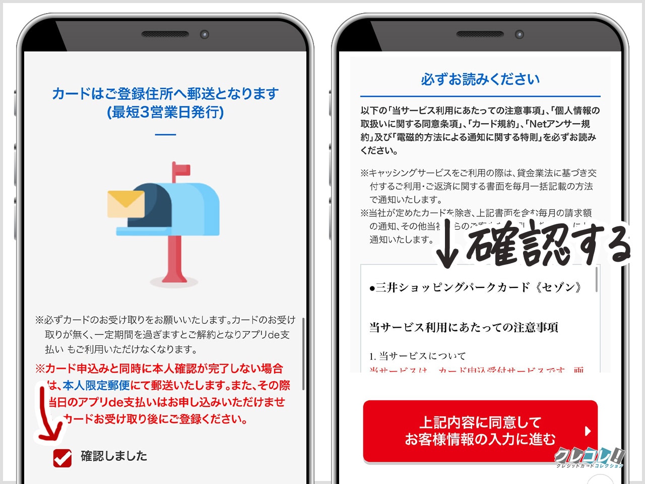 カードの郵送と受け取りについて説明が表示されるのでチェックボックスにチェックを入れます。