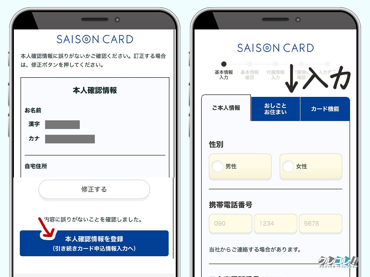 すると「ご本人情報」「おしごとお住まい」「カード機能」の3つのタブが表示されるので1つずつ入力します。