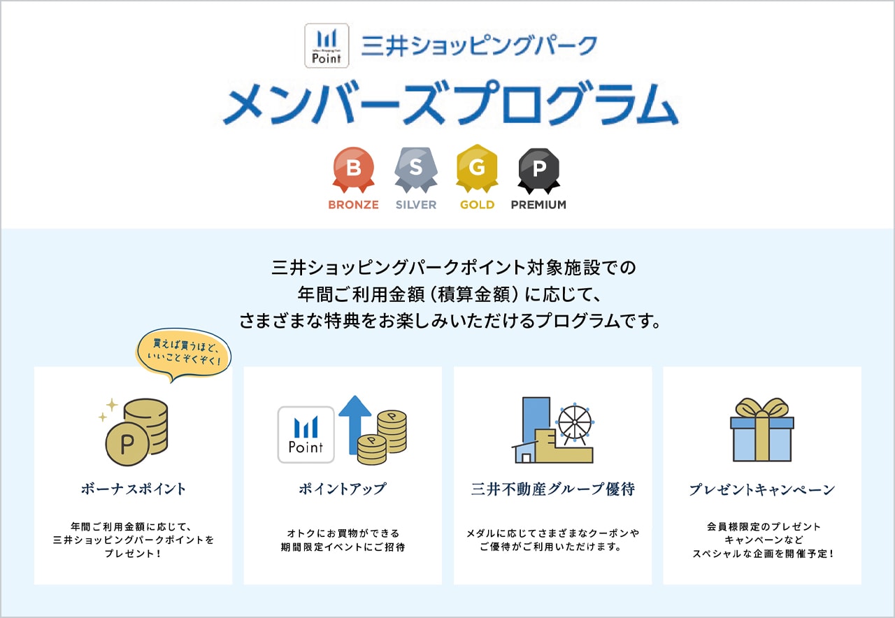 - 三井ショッピングパークの年間利用金額によって特典が受けられる