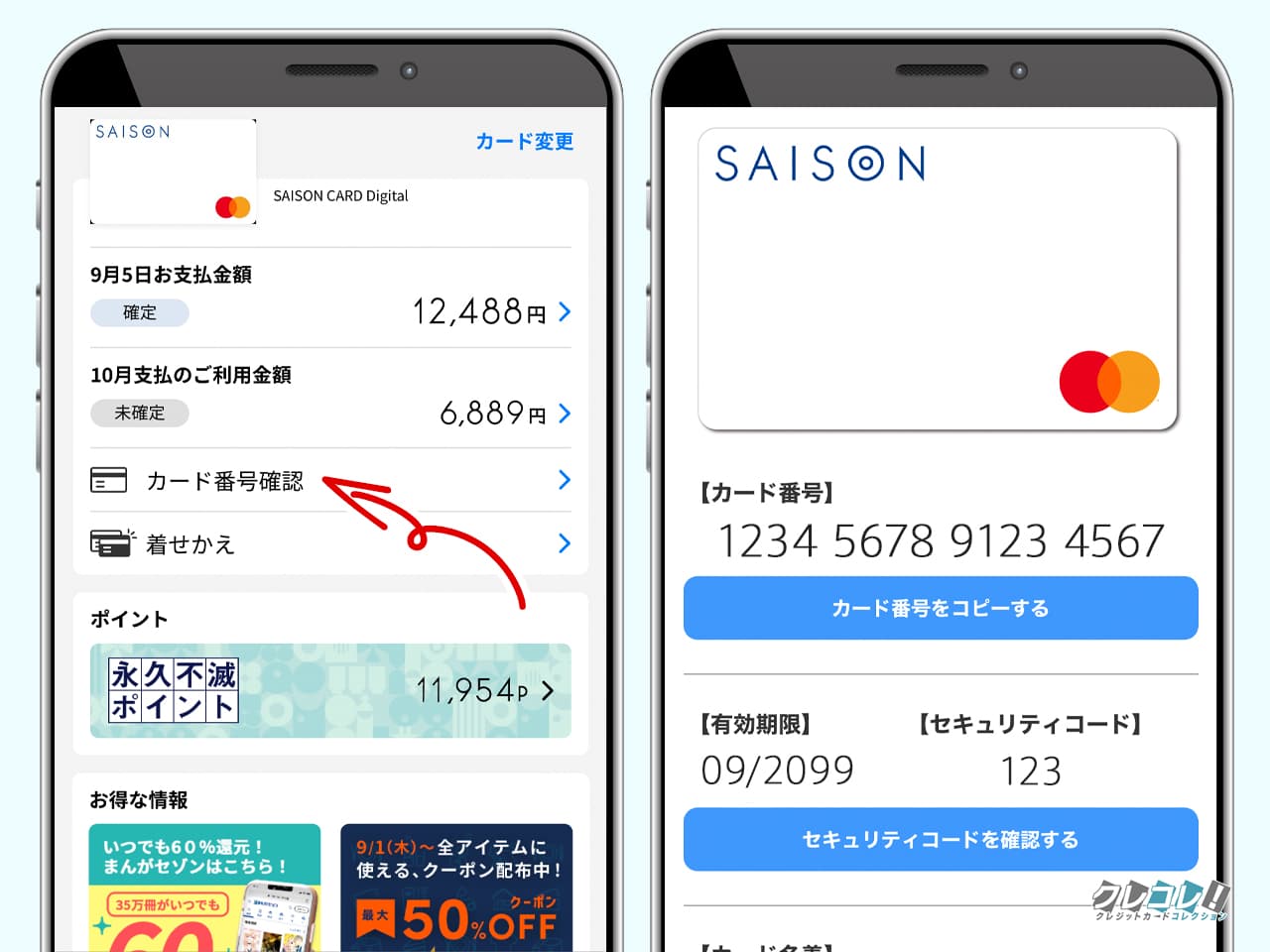 公式アプリ「セゾンPortal」の「カード番号確認」から、カード番号・有効期限・セキュリティコード・カード名義の情報を見ることができます。
