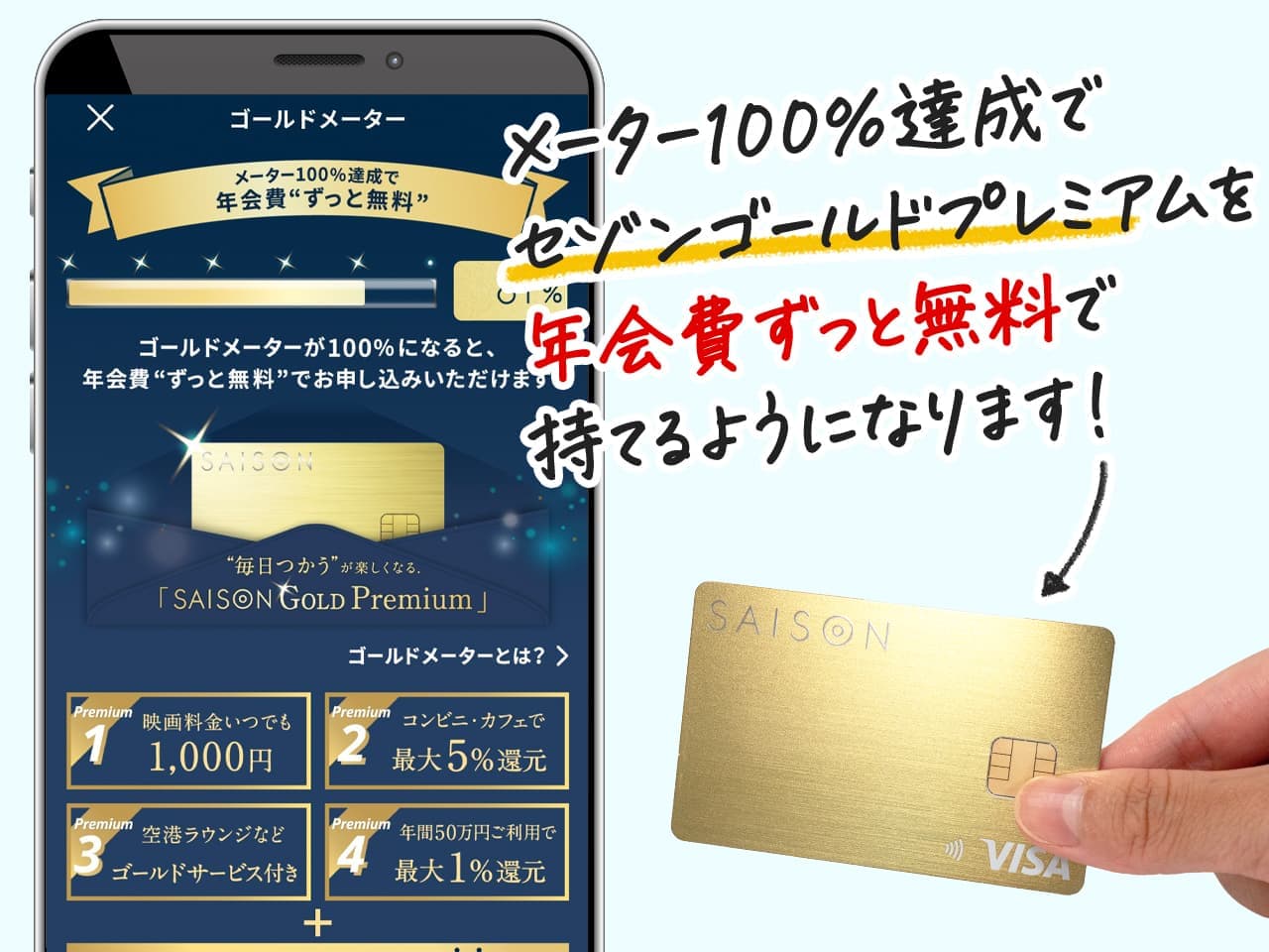 セゾンゴールドプレミアムは年間100万円利用で無料で持てます。
