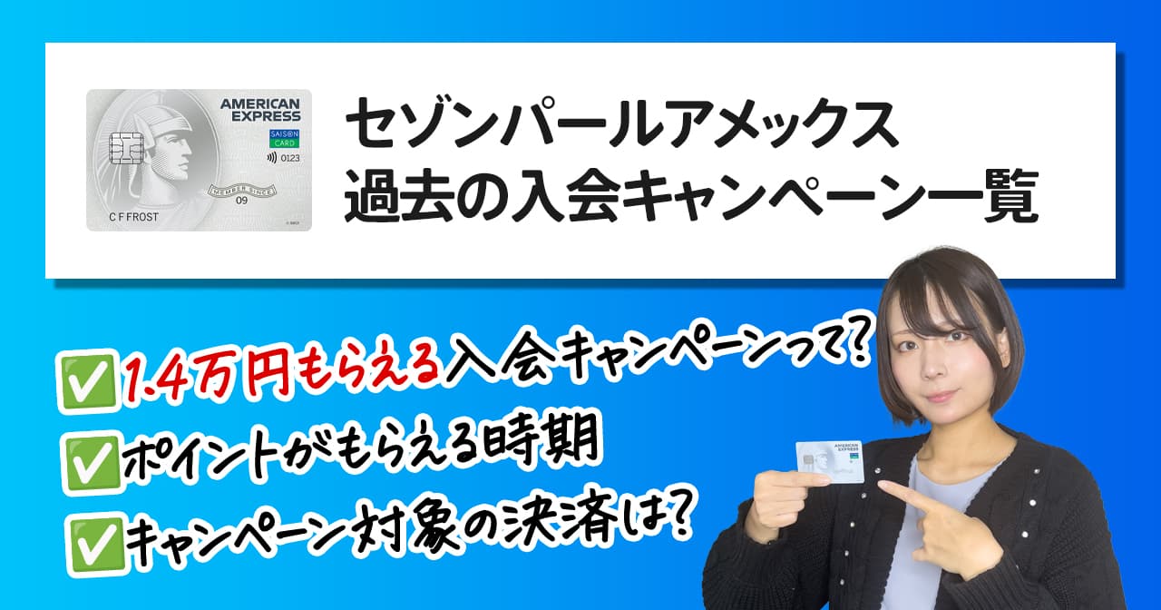 | 備考 | ※キャンペーンの適用は、本ページよりお申し込みいただいた場合に限ります。 ※「セゾンパール・アメリカン・エキスプレス®・カード」または「セゾンパール・アメリカン・エキスプレス®・カード digital」を過去に発行された方、現在お持ちの方はキャンペーン対象外となります。 ※審査により、お申し込みの意に添えない場合がございます。その場合は特典の対象外となります。あらかじめご了承ください。 ※本キャンペーンはエントリー不要です。キャッシュバックの上限金額は、お一人様14,000円までとなります。 ※家族カード(ファミリーカード)のご利用分もキャッシュバック対象です。キャッシュバック金額は本カード会員様のご利用分と合算のうえ、14,000円までとなります。 ※リボ手数料、年会費、au payチャージはキャンペーンの利用条件の対象外となります。 ※セゾン投信、大和コネクト証券の利用は、キャンペーンの利用条件の対象となります。 ※ご利用期間中に当社にて売上が確認でき、ご利用明細に記載された利用分のみがキャンペーンの対象となります。 ※返品や取り消しの場合、事務処理などの関係で当社で売上が確認できなかった場合も対象外となります。 ※特典は、キャッシュバック日のお引き落とし分に充当いたします。 ※お引き落とし分がキャッシュバック金額に満たない場合や、ご利用がない場合は差額をお引き落とし口座へご入金いたします。 ※特典付与時点でカードを解約されている、または口座登録の設定がなされていない場合は特典対象外となります。 ※カードのお支払い状況によっては、本キャンペーンの対象外となる場合がございます。 ※他キャンペーンや特典との重複によるプレゼントはございません。 ※特典をお受け取りいただけなかった場合は、付与時期から6ヵ月後の月末までにお申し出ください。お申し出のない場合は、お受け取りの権利を無効とさせていただきますのであらかじめご了承ください。 ※本企画は、予告なく変更・中止させていただく場合がございます。 |