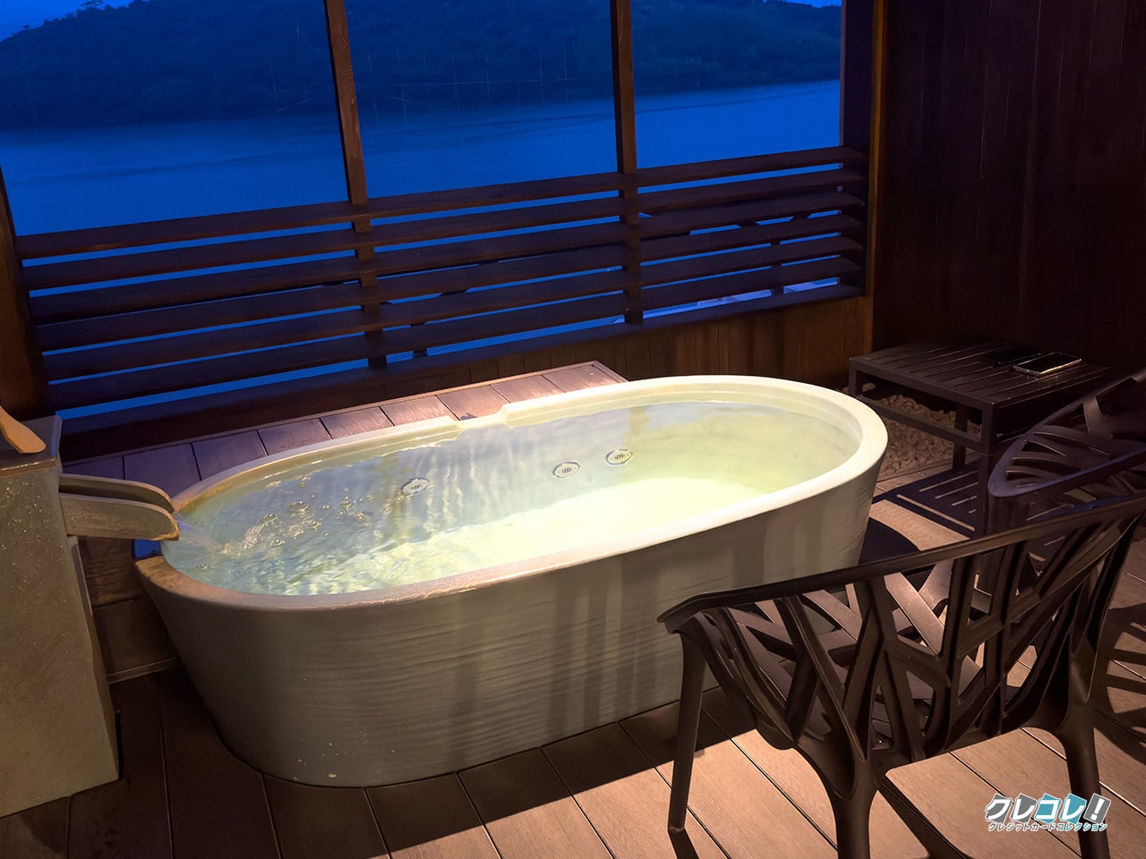 遠州の露天風呂付き客室では、浜名湖を一望できるお風呂がありました。