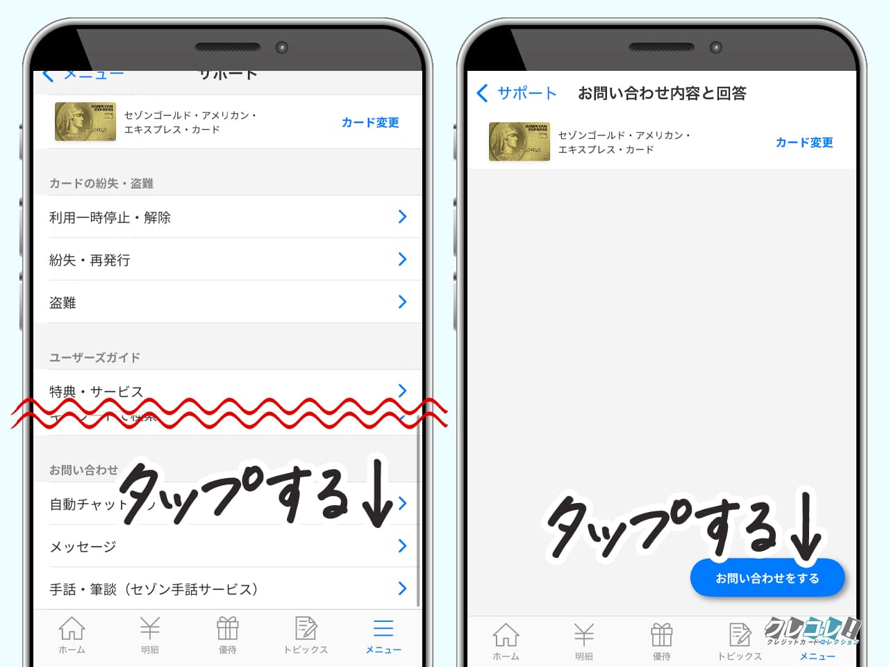 問い合わせをする時はカード番号などカード情報が必要になるので、手元にカードを用意してください。
