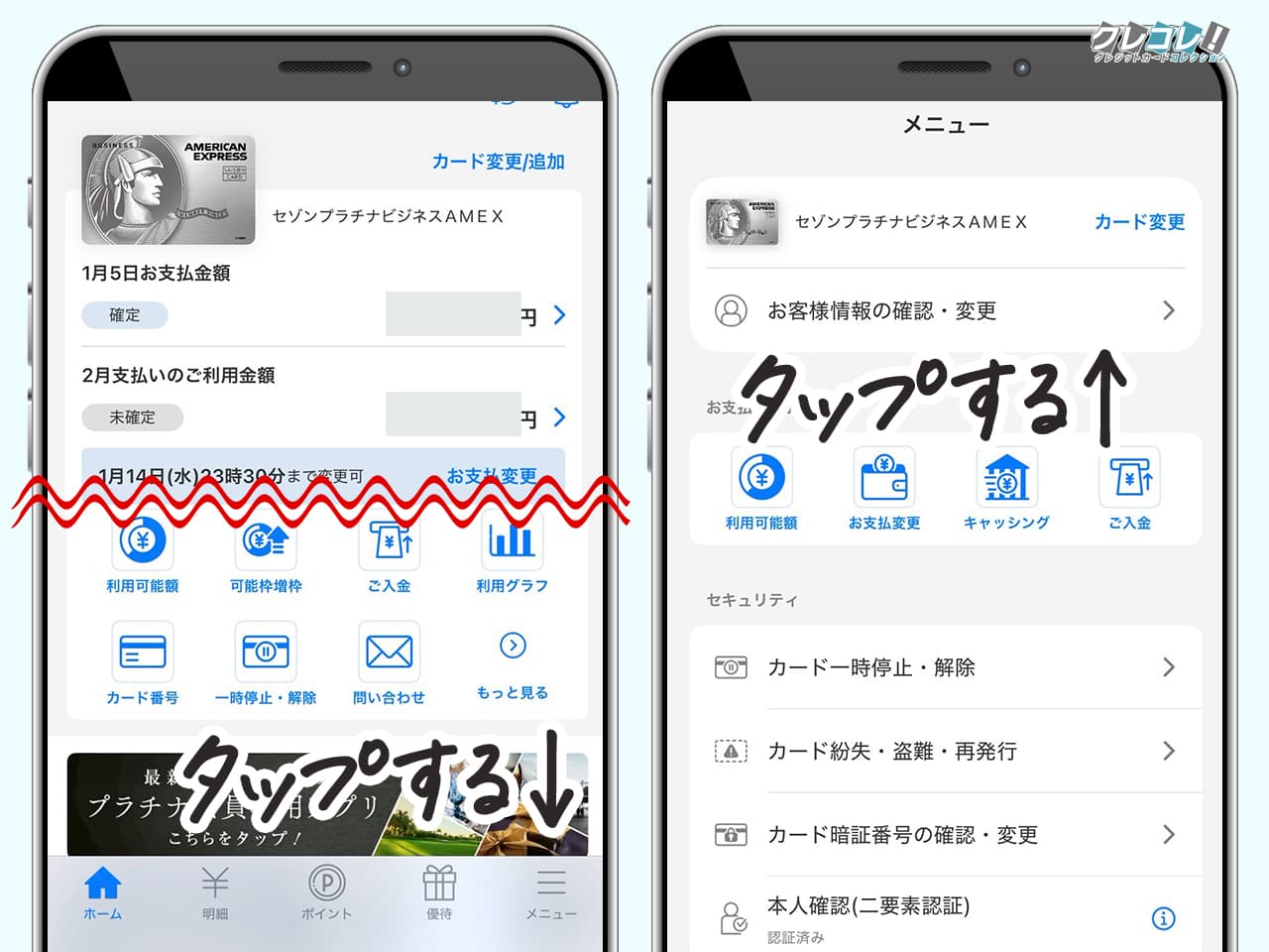 まずセゾンPortalアプリを開き右下のメニューをタップします。