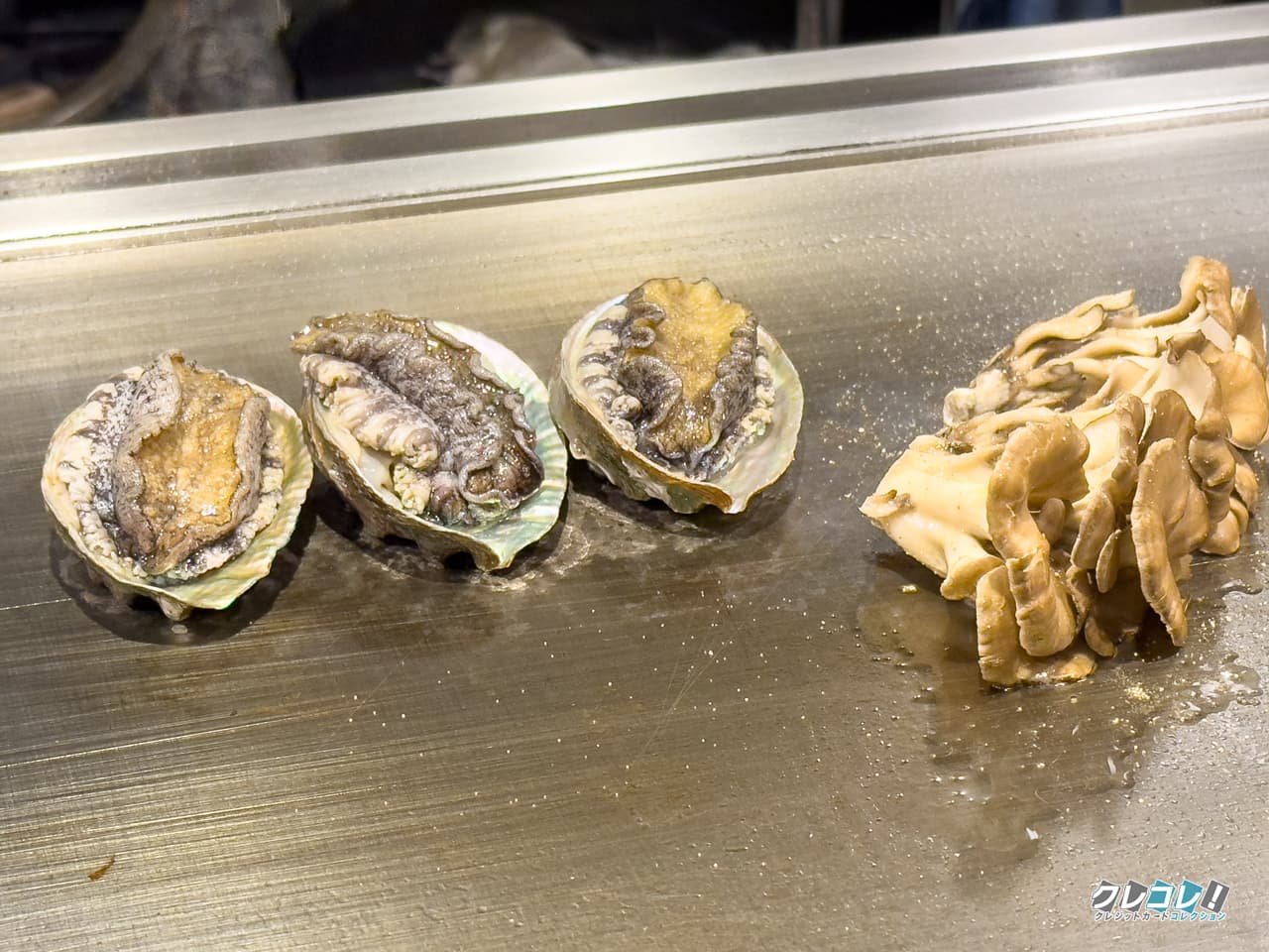 目の前で水槽から取り出したアワビを鉄板で焼いてくれるので、迫力満点!