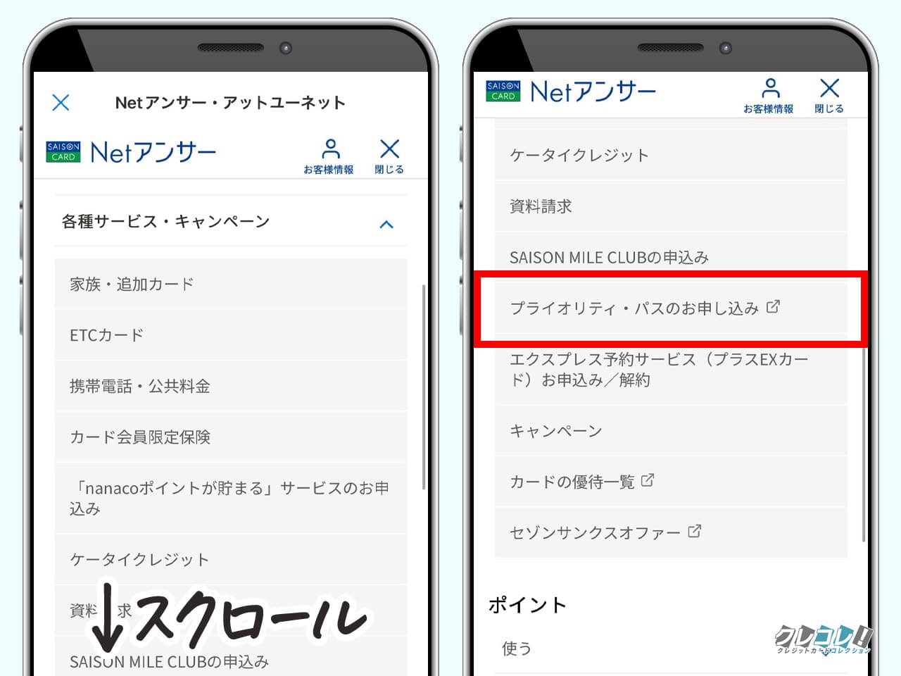 折りたたまれているサービスの中に、「プライオリティ・パスのお申し込み」があるのでタップ。