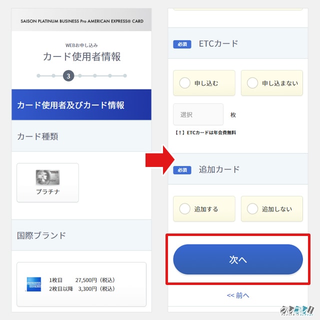 続いてカード利用者の情報を入力していきます。必要な方はこの画面でETCカードや追加カードに申し込みます。