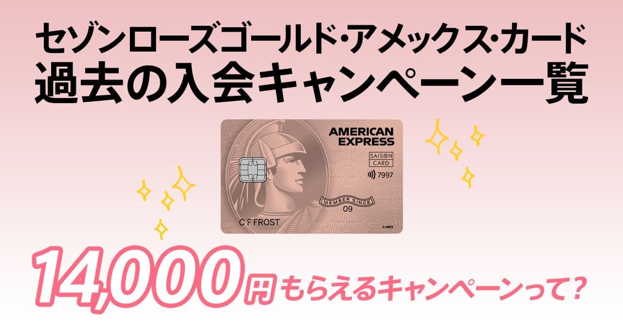 | 備考 | ※キャンペーンの適用は、本ページよりお申し込みいただいた場合に限ります。 ※「セゾンローズゴールド・アメリカン・エキスプレス®・カード」を過去に発行された方、現在お持ちの方はキャンペーン対象外となります。 ※審査により、お申し込みの意に添えない場合がございます。その場合は特典の対象外となります。あらかじめご了承ください。 ※本キャンペーンはエントリー不要です。キャッシュバックの上限金額は、お一人様14,000円までとなります。 ※家族カード(ファミリーカード)のご利用分もキャッシュバック対象です。キャッシュバック金額は本カード会員様のご利用分と合算のうえ、14,000円までとなります。 ※リボ手数料、年会費、au payチャージはキャンペーンの利用条件の対象外となります。 ※セゾン投信、大和コネクト証券の利用は、キャンペーンの利用条件の対象となります。 ※ご利用期間中に当社にて売上が確認でき、ご利用明細に記載された利用分のみがキャンペーンの対象となります。 ※返品や取り消しの場合、事務処理などの関係で当社で売上が確認できなかった場合も対象外となります。 ※特典は、キャッシュバック日のお引き落とし分に充当いたします。 ※お引き落とし分がキャッシュバック金額に満たない場合や、ご利用がない場合は差額をお引き落とし口座へご入金いたします。 ※特典付与時点でカードを解約されている、または口座登録の設定がなされていない場合は特典対象外となります。 ※カードのお支払い状況によっては、本キャンペーンの対象外となる場合がございます。 ※他キャンペーンや特典との重複によるプレゼントはございません。 ※特典をお受け取りいただけなかった場合は、付与時期から6ヵ月後の月末までにお申し出ください。お申し出のない場合は、お受け取りの権利を無効とさせていただきますのであらかじめご了承ください。 ※本企画は、予告なく変更・中止させていただく場合がございます。 |