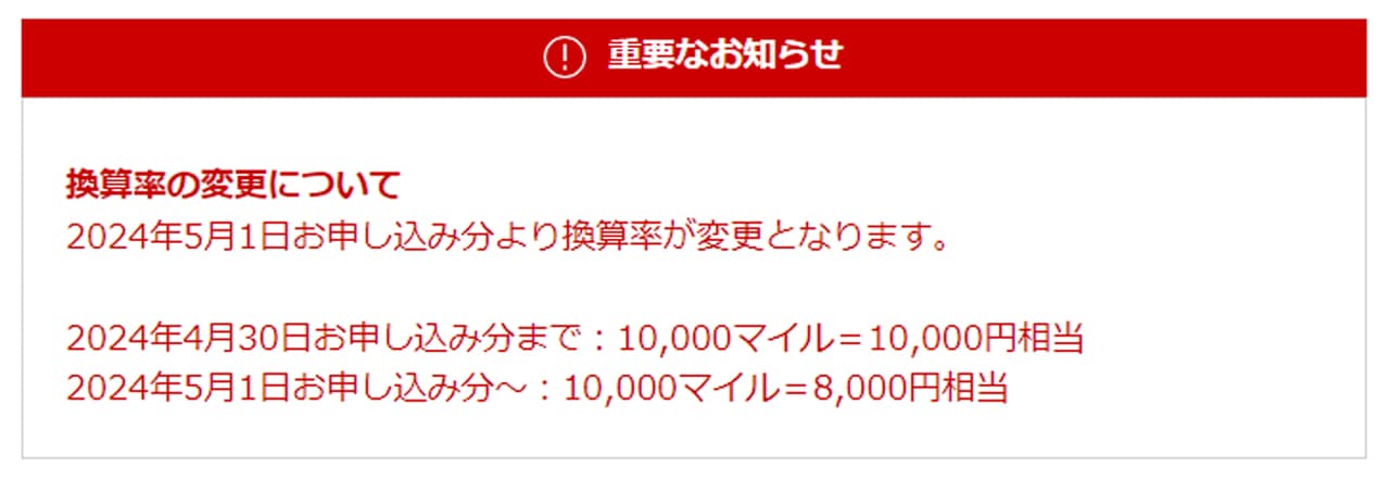 2024年4月30日申し込み分までは10,000マイル=10,000円相当で交換できるので、これは大きな改悪です。